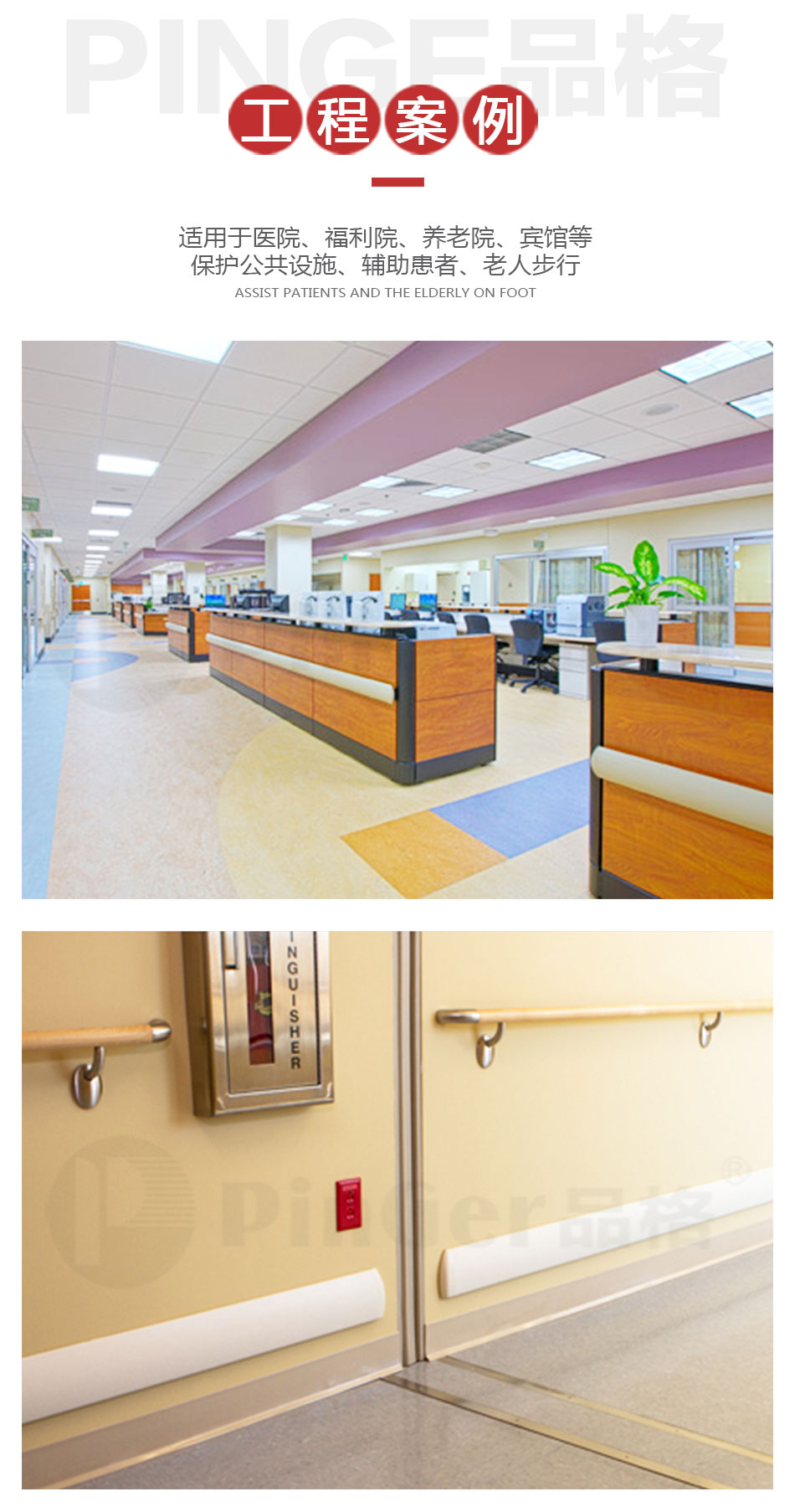 (6)防撞耐磨,抗冲击强度高:产品防撞耐磨性能优越,能够很好的保护墙体, 延长建筑使用年限;在国标落锤冲击试验下,扶手无损坏。